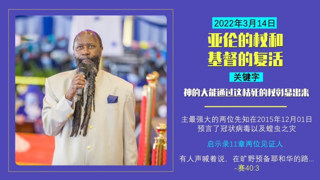 這個事情只有當祂茂盛開花結果子以後才能發生,就是祂復活之後才可以發生,看一下,復活的大能可以做到這一切事情,甚至這兩位先知的事工,這是彌賽亞復活的大能,這就是為什麼他們來預備列國,來享受復活的成就,就是打敗死亡,這就是允許我們來嘗一嘗 神的真理,並且鏟除掉世上的謊言。這就是允許祂,那亞倫發芽的仗,來象徵著基督的復活,也允許祂破壞撒旦。當祂說到我戰勝了世界時,約翰福音15章3節。