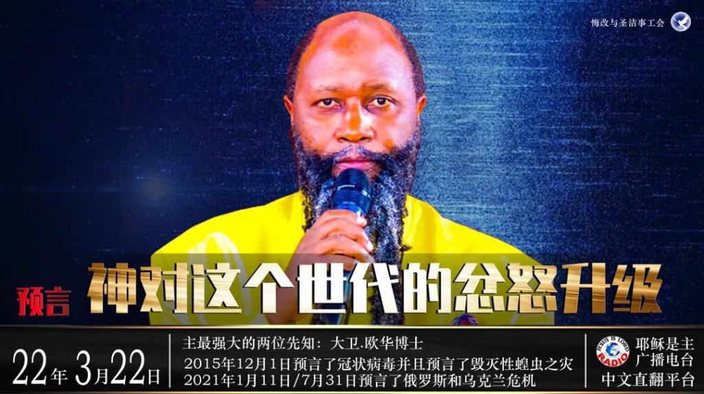 你們在和我開玩笑,你不知道我是那位帶來這場戰爭的!我用冠狀擊打地球!我用埃及的蝗蟲擊打地球!我用這場戰爭擊打地球!你們還沒有悔改!我很憤怒,這是主說的!我的烈怒會毀滅你們!我可以現在就埋葬你們!現在看看歐洲將會發生什麼!導彈將要來擊打列國!現在我看到很多國家被極大地破壞,被擊打,被擊打,用核武器!