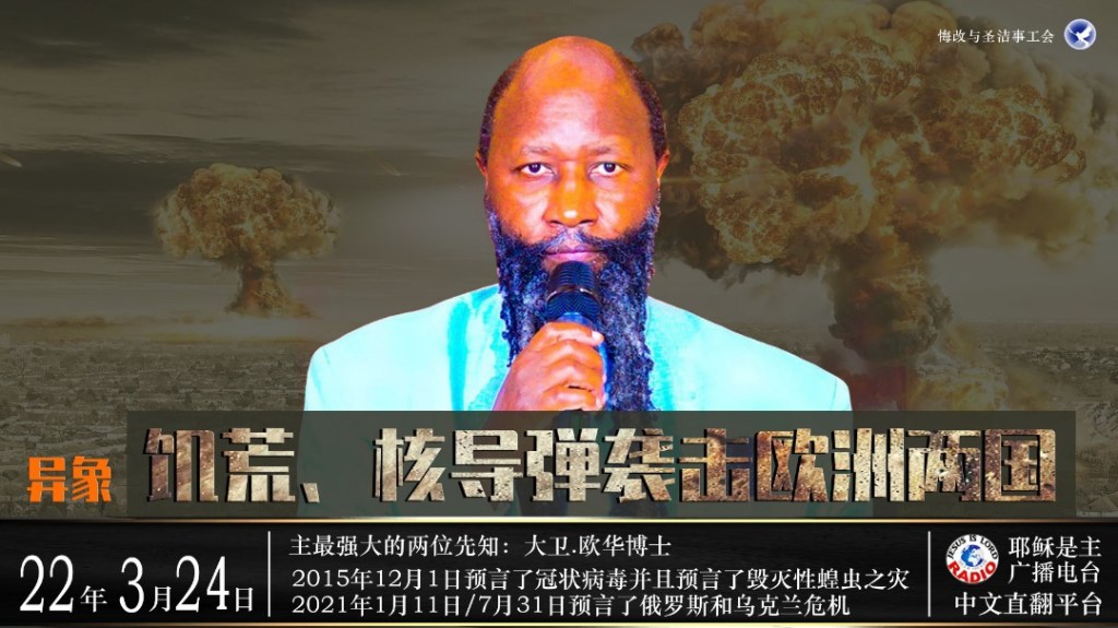 因此,你看到我所命令的戰爭,我用我先知性的舌頭所命令的戰爭將要臨到地球,直到俄攻打烏,那個戰爭將要變得更劇烈。主正在徹底瓦解現代化、發展、後現代化,以及人類的發達,好把他們從自滿中救出來,讓他們可以關注雅威的這兩位先知,這一個宣告彌賽亞來臨的聲音。當彌賽亞要來時,列國卻忽視,這是不能的!列國忽略!列國在自滿中,在完全的罪中,不重視,不在意,不在乎。因此主現在要強迫他們關注這個聲音。主已經要求我將食物從他們的桌上挪去,今天,嚴格基於我口中的話,現在地上將會有食物短缺!第二點,將會有核導彈擊打歐洲的國家,俄羅斯將會發射核導彈來摧毀歐洲的某些國家。我看到兩個國家被擊中,我不知道是否會有更多,但是我看到兩個國家被擊中,被非常非常嚴重的擊打,非常嚴重,這看起來是核武器。那些看起來是核導彈。